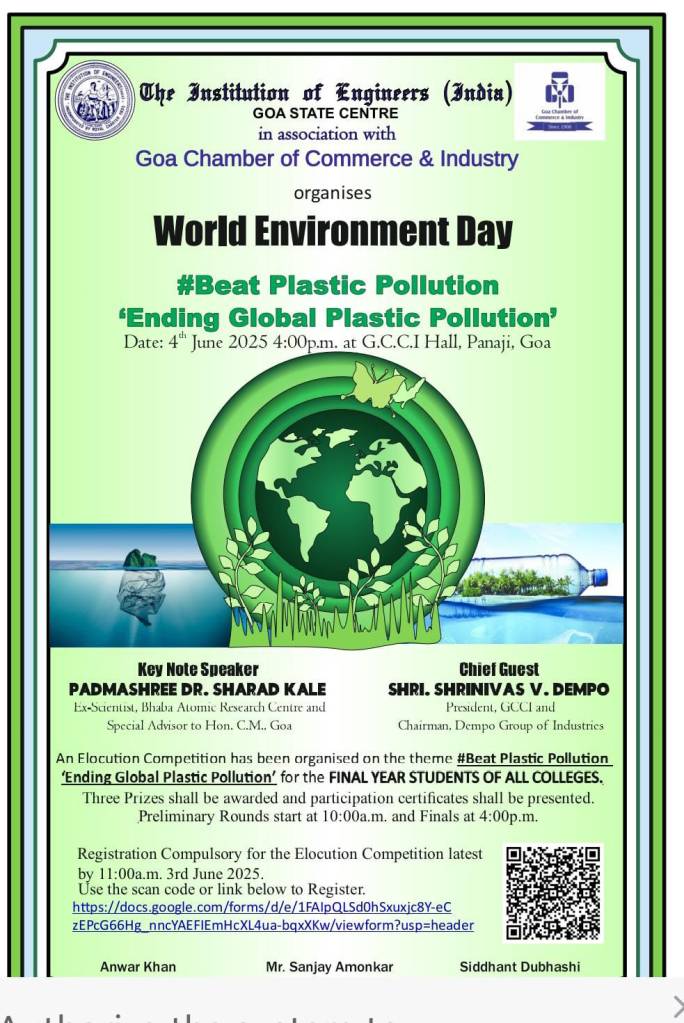 In honor of World Environment Day 2025, the Goa Chamber of Commerce & Industry (GCCI), in collaboration with the Institution of Engineers (India), is hosting an Elocution Competition that challenges the next generation of leaders to tackle one of the world’s most pressing environmental issues — Plastic Pollution. The competition is set to take place on Wednesday, June 4, 2025, at the Surendrababu Timblo Convention Hall, Panjim, and promises to be an exciting platform for final-year students from all colleges across Goa to showcase their oratory skills and raise awareness about environmental issues.